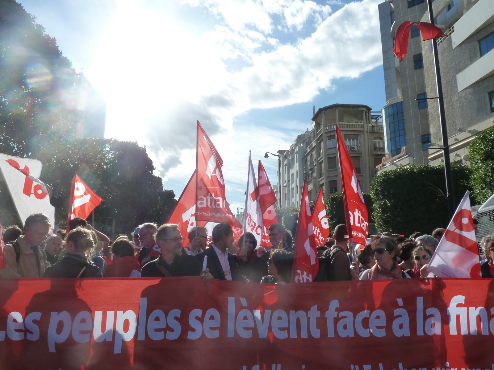 Attac from Europe, Chile, Japan, North Africa and West Africa gathered in the march to make some attention to the importance of supporting the people and not the finance. Attac France’s megaphone, flags and banner were quite handy to do so.